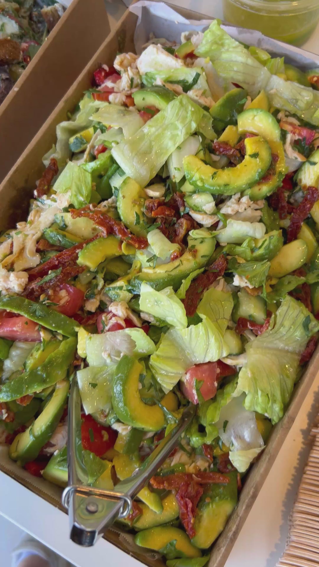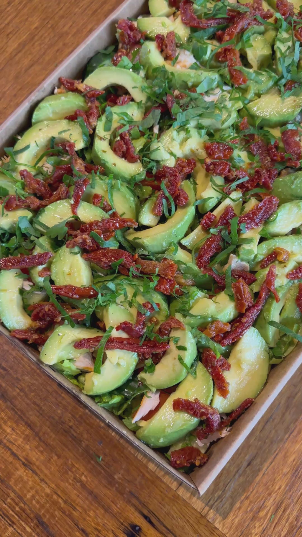 A fresh and vibrant salad featuring tender chicken, creamy avocado, crisp cos lettuce, tomato, cucumber, sundried tomatoes, parsley, and spring onion, all tossed in a zesty lemon dressing. Perfect for catering, corporate lunches, or sharing at events!